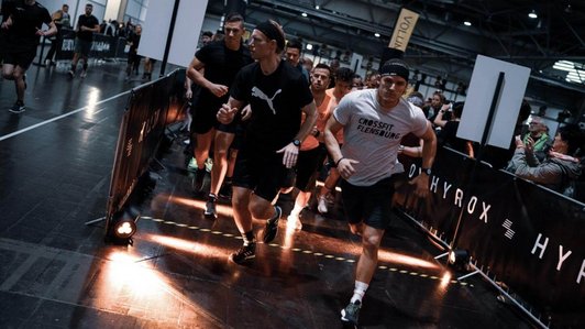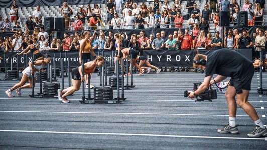 HYROX 是一项面向全球所有人的健身赛事。来自世界各地的参赛者以完全相同的赛制同场竞技。比赛以 1 公里跑开始,随后进行一项功能性训练——这一环节重复八次。比赛场地为大型室内场馆,营造出独特的体育场氛围。